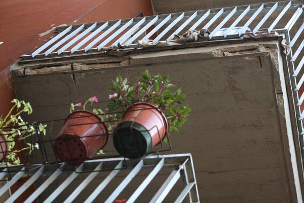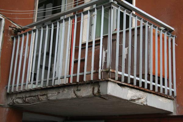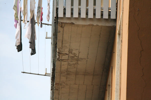Saranno anche case popolari. Si pagherà anche un affitto piuttosto basso e agevolato. Saranno pure ubicate in una zona poco visibile, nella frazione di San Felice, a fianco dell’autostrada. Ma i dieci palazzi dell’Aler di Cremona ubicati tra via Salvador Allende e via Federico Caudana (in totale circa 120 appartamenti) non si possono lasciare così. Il cemento si sta sgretolando, rendendo progressivamente visibile l’anima in ferro del tutto arrugginita. Così, all’ingresso e così su ogni balcone. Da sotto, è impressionante. Ci sono balconi con vasi di fiori e panni stesi che hanno gli angoli tutti smussati e lastre di ferro in parte staccate. Nelle cantine, ubicate al piano terreno, si vedono crepe piuttosto profonde che tagliano le pareti da destra a sinistra, in alto e in basso. Poi, ci sono fili scoperti e all’ingresso buchi grandi quanto un piede. Gli estintori – ci dicono – non vengono revisionati dal 2009 e all’ultimo piano di uno dei condomini si sta staccando l’intonaco del soffitto per un’importante perdita di acqua dal tetto.