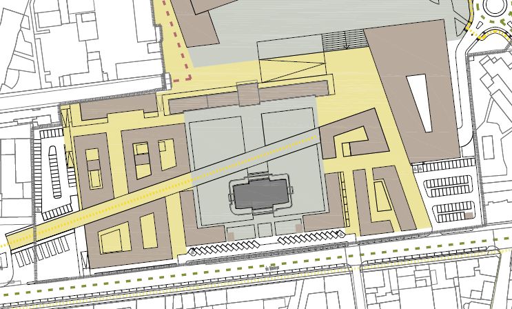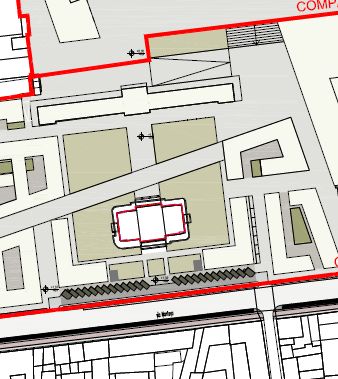 In compenso tutti i 163 tigli oggi esistenti verranno tagliati. La scarsissima attenzione che è stata rivolta ai pedoni, ai ciclisti e in genere a un ambiente urbano meno soffocante la si nota dalla pista ciclabile che passa dalla nuova piazza e termina infrangendosi contro un edificio (tratteggio giallo):