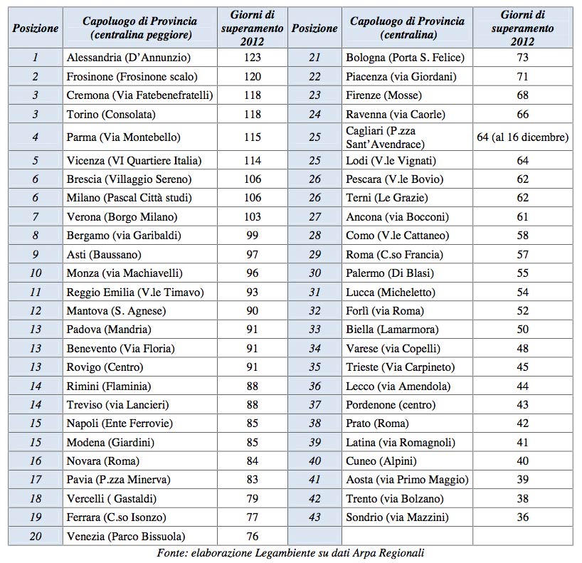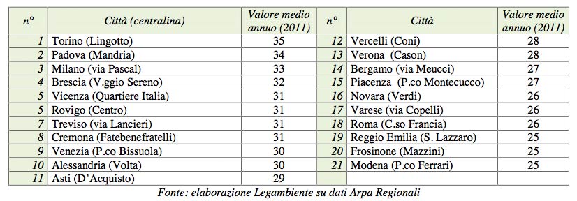 “Pm10 ti tengo d’occhio”: la classifica dei capoluoghi di provincia che hanno superato la soglia limite di polveri sottili in un anno. Il Dlgs 155/2010 prevede un numero massimo di 35 giorni/anno con concentrazioni superiori a 50 ?g/m3.