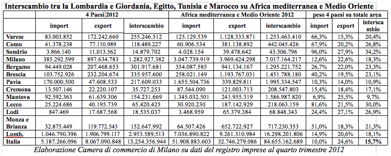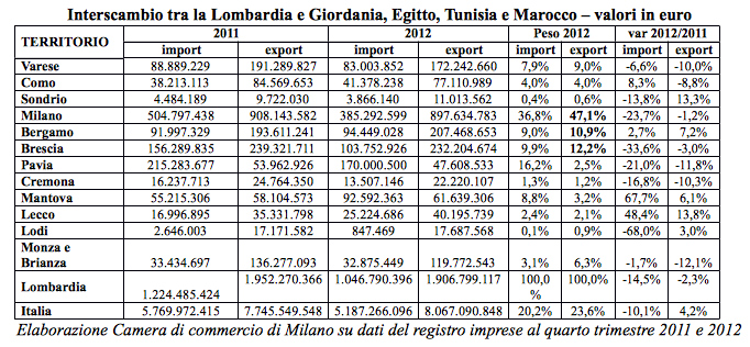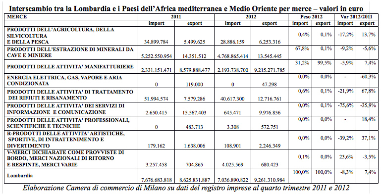 Il tutto emerge da un’elaborazione Camera di commercio di Milano su dati Istat relativi agli anni 2012 e 2011 e su dati del registro imprese al primo trimestre 2013 e 2012. Proprio in mattinata alla Camera milanese è stato organizzato un seminario dal titolo “Italia e Sud Est Mediterraneo: opportunità di investimento”.