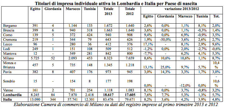 Sono quasi 19mila, inoltre, gli imprenditori attivi in Lombardia, nel primo trimestre 2013, e nati tra Tunisia, Egitto, Marocco e Giordania, in crescita del 5,7% in un anno. Nel territorio cremonese se ne contano 643 (+2,7%).