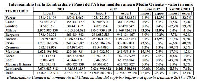 Più di 16 miliardi di euro. E’ il valore dell’interscambio lombardo con i Paesi mediterranei del Nord Africa e del Medio Oriente nel 2012. Un interscambio trainato dalle esportazioni, oltre 9,2 miliardi, in crescita del 7,4% a fronte di un -8,3% registrato per l’import. E’ il territorio milanese il primo per scambi (43% dell’import-export regionale), sul podio salgono anche Pavia (23,5% lombardo) e Mantova (19,1%) per import, Brescia (12,9%) e Varese (12,2%) per export. Cremona, fra 2011 e 2012, vede una crescita delle esportazioni del 5,2%; prevedibile il calo registrato nelle importazioni, soprattutto dalla Libia: -70%.