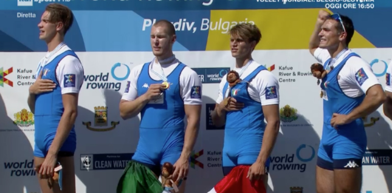 AGGIORNAMENTO – Ai Mondiali di Plovdiv di Canottaggio è arrivato il giorno delle finali, con grande attesa per assistere alla performance del quattro di coppia tutto fiamme gialle del bissolatino Giacomo Gentili, con Filippo Mondelli, Andrea Panizza e Luca Rambaldi. Grande favorita per le prestazioni in crescendo culminate con l’oro europeo, la barca azzurra in acqua 6 si mette in mostra fin dalle prime battute, dimostrando di essere la squadra da battere. Con una bella remata, scandita dal ritmo del capovoga cremonese, l’Italia si porta al comando continuando a guadagnare, metro dopo metro, sulle avversarie arrivando all’intertempo dei 1500 ad avere sull’Olanda circa 2” di vantaggio con i quali può gestire i metri delle boe rosse e conquistare un magnifico oro mondiale.