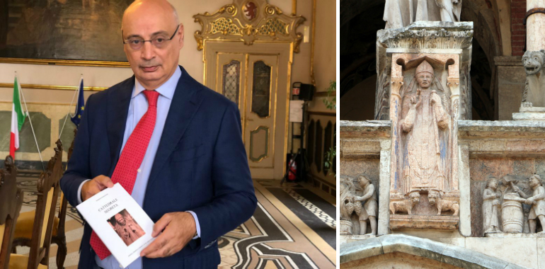 Roberto Fiorentini con il suo libro e la statua di Sicardo