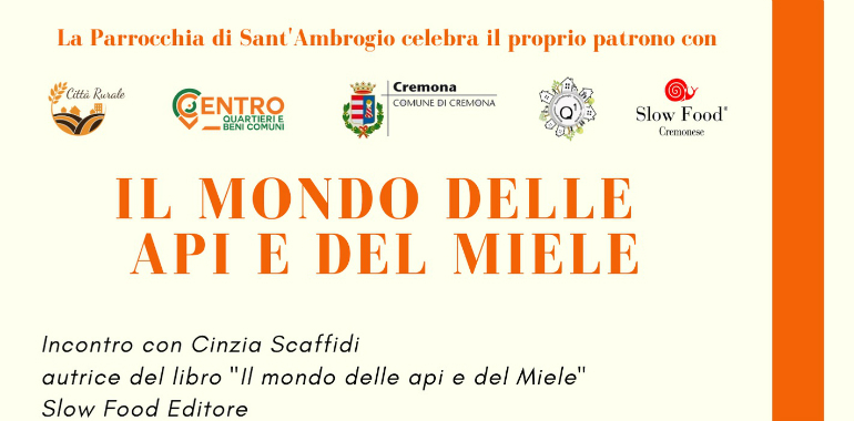 Città Rurale, l’Associazione che promuove “Cremona Urban Bees – Apicoltura in città” sostenuta dal Comune di Cremona tramite “Patto di Collaborazione”, in collaborazione con Slow Food Cremonese, Comitato di Quartiere 1 e la parrocchia di S.Ambrogio, organizzano per venerdì 6 dicembre alle ore 20.45 presso il Salone-Teatro dell’oratorio di S.Ambrogio (Via S.F.d’Assisi), una serata dedicata al “Mondo delle api e del miele” in compagnia di Cinzia Scaffidi, giornalista, docente presso l’Università di Scienze Gastronomiche di Pollenzo ed autrice dell’omonimo libro edito da Slow Food.