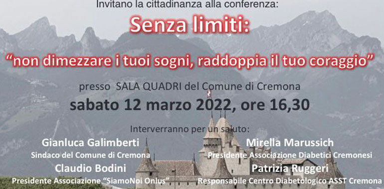 “Senza Limiti; non dimezzare i tuoi sogni, raddoppia il tuo coraggio”. E’ il titolo dell’incontro organizzato per sabato 12 marzo alle 16,30 nel salone dei Quadri in Comune. Relatori saranno due testimonial d’eccezione: Gianpaolo Fattori, tedoforo e volontario della Protezione Civile reduce dal cammino lungo la Francigena, da Canterbury a Roma, e Marco Mangiarotti, il triathleta cremonese arrivato ottavo nella sua categoria all’Ironman Italy di Klagenfurt nel 2021 ed in procinto di partire per le Hawaii per il Campionato Mondiale Ironman. L’incontro è promosso dall’Associazione diabetici cremonesi con il patrocinio del Comune e dell’associazione “Siamo Noi”. A moderare il dibattito, la giornalista di Cremona1 Cristina Coppola.