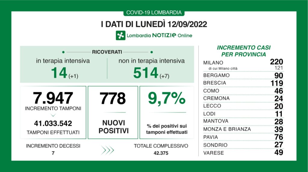 La percentuale di positività tra i lombardi è del 19,4%, 778 i tamponi esaminati globalmente. Un ricovero in più rispetto a ieri in terapia intensiva e 7 in più nei reparti ordinari. Sette sono anche i decessi.