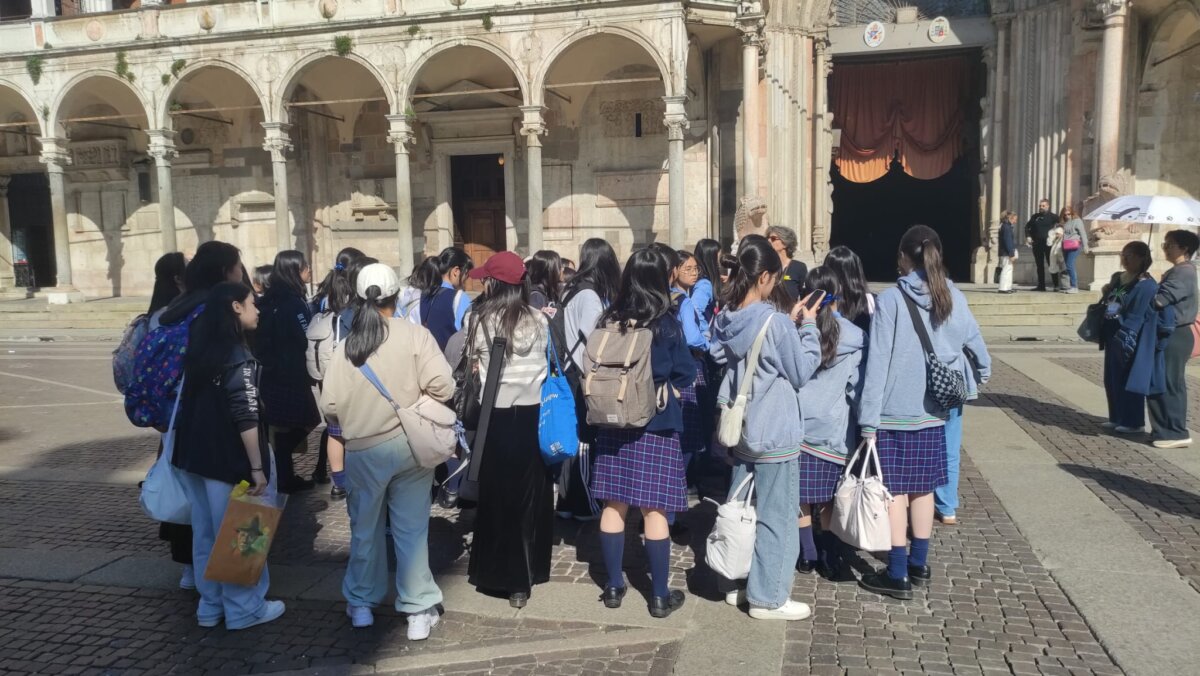 Tanti visitatori già nella giornata di sabato in piazza del Comune: coppie, famiglie e anche un gruppo di ragazzi di una scuola di musica di Hong Kong