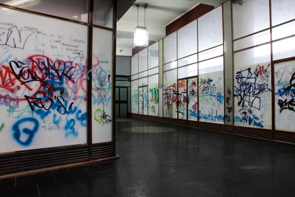 Sicuramente l’architettura anni sessanta, vecchia nelle idee ancor prima che nell’estetica non aiuta, ma il vero disagio che assale chi cammina lungo i suoi 100 metri circa, è lo stato di completo abbandono. Ogni metro quadrato di parete, sia esso vetrina o muro, è interamente ricoperto di scritte, muffa e sporcizia. I lucernari, opacizzati dal tempo, diffondono nell’ambiente una luce tetra, resa fredda dai tubi al neon dell’illuminazione. Un tappeto di linoleum nero antiscivolo ricopre il pavimento, dando all’ambiente quell’atmosfera tipica da stazione della metropoli che ormai nemmeno le stazioni della metropolitana hanno più. I cartelli la indicano come uno spazio privato dove non introdurre biciclette, ma spesso questi cartelli rimangono inascoltati. Alcuni residenti raccontano che qualche volta si sono viste anche automobili parcheggiate. In Galleria Kennedy diversi negozi hanno aperto e poi chiuso con cicli molto veloci fino ad oggi dove tutto è vuoto. Le uniche attività sopravvissute sono lo storico “La Mela Proibita” che da anni resiste in questo angolo morto della città – forse non a caso – e il centro estetico “Impero del Sole”.