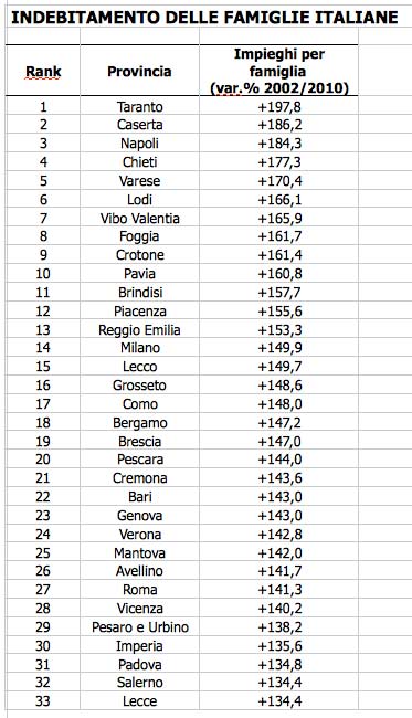 Dall’introduzione dell’euro (anno 2002), la crescita dell’indebitamento medio delle famiglie italiane è stato del +131%. Anche in questo contesto Cremona è tra le aree in cui l’aumento a segnato maggiormente. La graduatoria la vede al 21esimo posto (+143,6% tra 2002 e 2010), mentre in vetta si trova Taranto (+197,8).