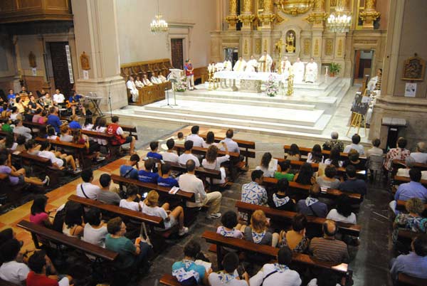 Giunti a Benicarlò nella tarda serata di giovedì 11 agosto, i 400 giovani cremonesi hanno vissuto quattro intense giornate di gemellaggio con i loro coetanei e le famiglie della popolosa cittadina sul mare nella comunità autonoma valenciana. Giorni intensi che hanno permesso di conoscere la cultura, le tradizioni, ma anche la fede di un popolo non così distante da quello italiano. Lunedì 15, alle 10, è stata celebrata la Messa di commiato, nella solennità dell’Assunzione di Maria al Cielo, nella chiesa parrocchiale di San Bartolomeo. L’Eucaristia è stata presieduta da don Enrico Maggi, parroco del Cambonino, e concelebrata da tutti i sacerdoti cremonesi presenti e, ovviamente, anche dai preti di Benicarlò: il parroco don Carlos e il vicario don Juan. Ad animare i canti i giovani italiani diretti da don Michele Martinelli.