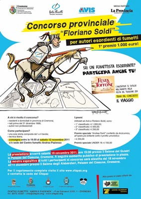 Floriano Soldi è stato uno dei pià prestigiosi giornalisti cremonesi e ha diretto il settimanale Mondo Padano, per poi collaborare come editorialista del quotidiano La Provincia. La sua prematura scomparsa ha lasciato non solo un vuoto professionale, ma anche umano, che il Centro Fumetto ha potuto apprezzare negli anni in cui proprio Mondo Padano sponsorizzava il concorso esordienti. Non solo Floriano Soldi assicurò il massimo sostegno della testata, ma fu sempre vicino sia agli organizzatori che agli autori locali per incoraggiarli. Floriano è stato sempre un sostenitore del talento e della creatività giovanile. Ed è per questi motivi che si è pensato di dedicargli il concorso, condividendo questa scelta con la moglie Sabrina Soldi Maiandi, che ringraziamo di cuore.