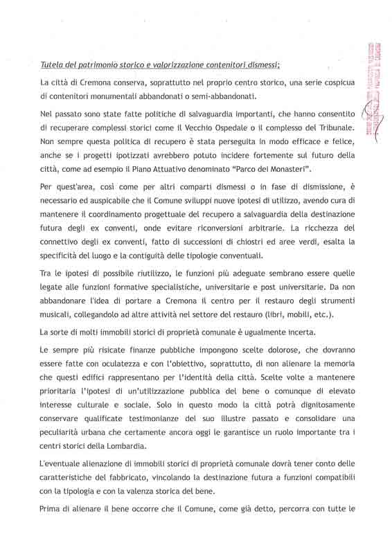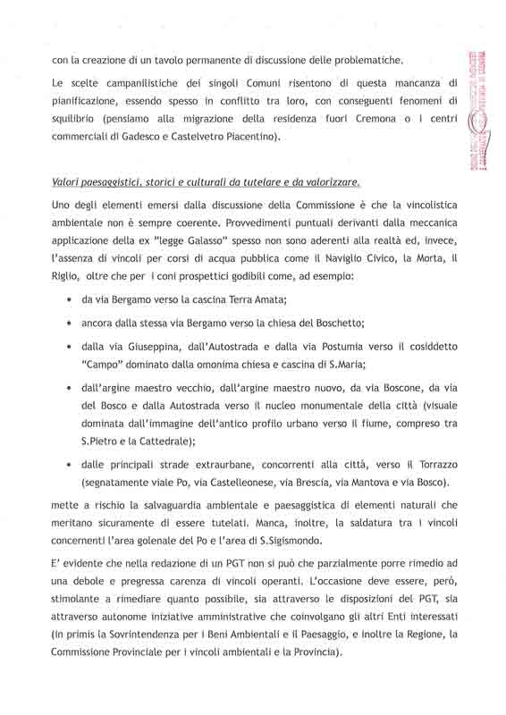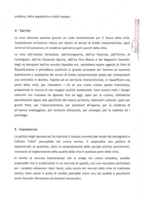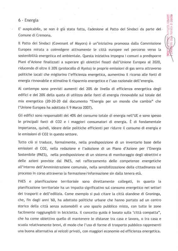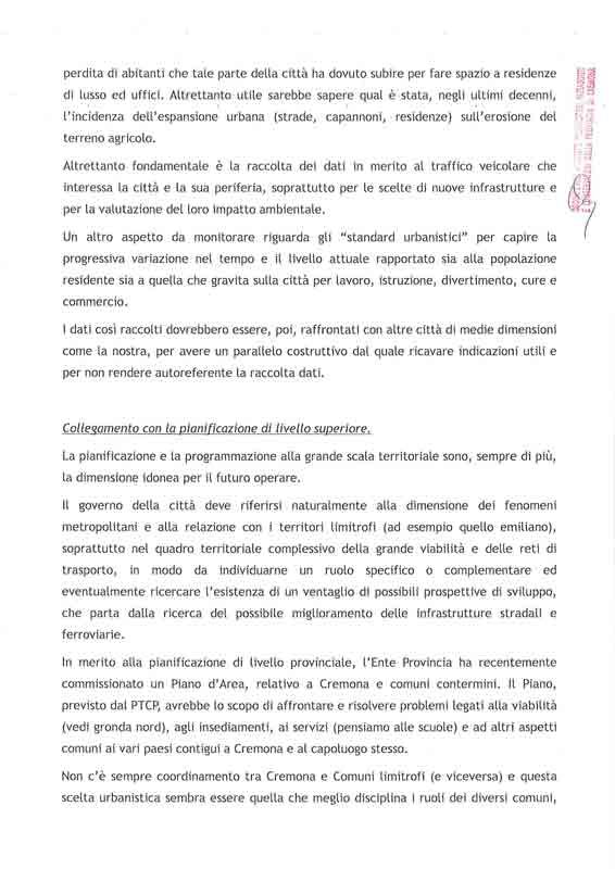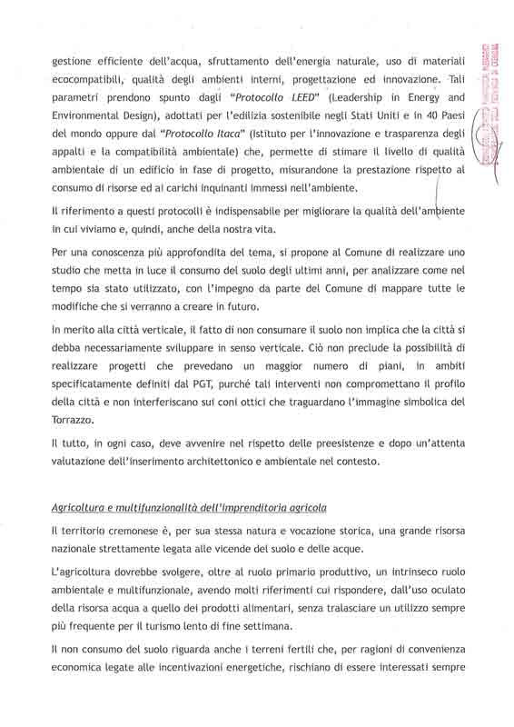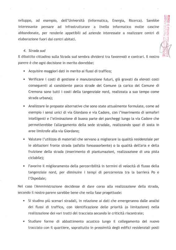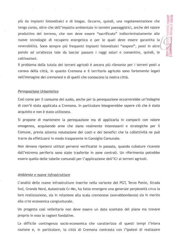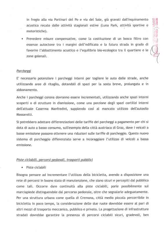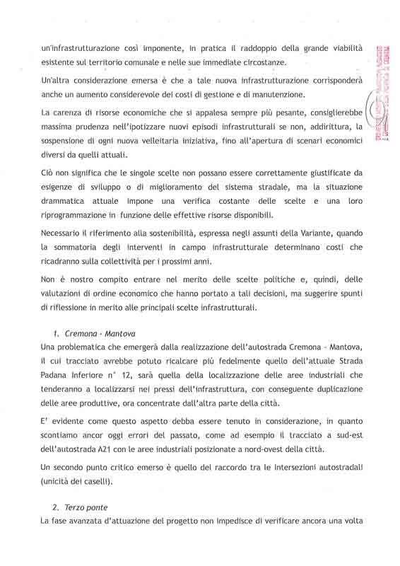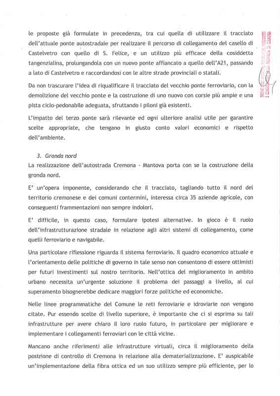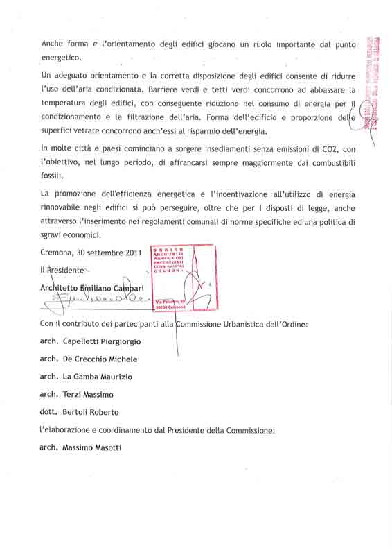 Dopo queste premessi la commissione urbanistica dell’Ordine degli architetti entra nel dettaglio del collegamento del Piano con la pianificazione di livello superiore e con quella dei Comuni vicini, con i valori paesaggistici, storici e culturali da tutelare (i corsi di acqua pubblica, i coni prospettici godibili, il suolo da conservare senza cedere alla città verticale antistorica per Cremona, l’agricoltura). Gli architetti chiedono poi una revisione dell’applicazione della perequazione urbanistica utile solo per zone omogenee. Perplessità sono state espresse sulle nuove infrastrutture inserite nella Variante del Pgt: Terzo ponte, Cremona-Mantova, Gronda Nord, Strada Sud. Si tratta del raddoppio della viabilità ordinaria e, in un periodo di recessione, le opere pubbliche andrebbero scelte con prudenza. Nel dettaglio delle opere gli architetti dicono che la Cremona-Mantova porterà sconvolgimenti con la creazione di aree industriali lungo il tragitto, che il Terzo ponte è troppo impattante e andrebbe pensata una soluzione alternativa (utilizzare le campate del vecchio ponte della ferrovia, ad esempio), che la Gronda Nord è un’opera imponente che taglierà 35 aziende agricole, che la Strada Sud non è una priorità per Cremona (almeno con i dati disponibili). Per quanto riguarda i parcheggi si sottolinea come vadano potenziati i parcheggi interni per togliere le auto dalle strade magari facendo pagare tariffe basse a chi possiede auto a bassa emissione. Interessante anche il capitolo sulle piste ciclabili e sui trasporti pubblici (valutare la riattivazione delle linee filobus). Per le residenze gli architetti sottolineano come siano davanti agli occhi di tutti le enormi quantità di offerte di casa rispetto alla domanda per cui andrebbe incentivata la riqualificazione anzichè la nuova edificabilità. Un capitolo di grande interesse è quello della tutela del centro storico, della sua rivitalizzazione. Un capitolo è riservato alla distruzione del tessuto commerciale cittadino con l’avvento degli ipermercati, al mercato bisettimanale (dovrebbe essere tipico, con prodotti anche agricoli della tradizione locale). L’ultimo capitolo è riservato all’energia.