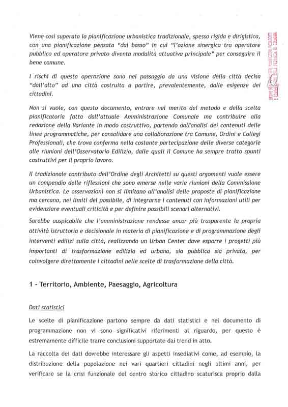 Gli architetti chiedono poi di avere dei dati statistici attendibili sulla crisi del centro storico, sulla sua abitabilità e quanto spazio abitativo si è perso per alloggi di lusso o per uffici. Altri dati interessanti da conoscere sono quelli sulla erosione di suolo agricolo per la nuova espansione urbana. Altri dati mancanti sono quelli sulla reale portata del traffico veicolare e quelli sugli standard urbanistici.