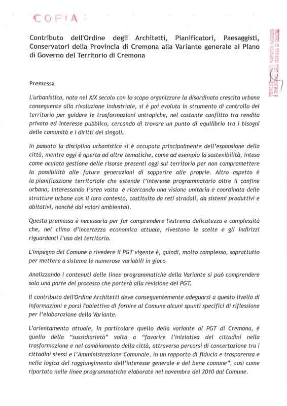 Gli architetti della Provincia di Cremona prendono posizione sulla variante generale al Piano di Governo del Territorio di Cremona. Un documento articolato predisposto dalla commissione urbanistica dell’Ordine costituita da Piergiorgio Capelletti, Michele de Crecchio, Maurizio La Gamba, Massimo Terzi, Roberto Bertoli coordinati dal presidente della commissione Massimo Massotti e sottoscritto dal presidente dell’Ordine Emiliano Campari.
