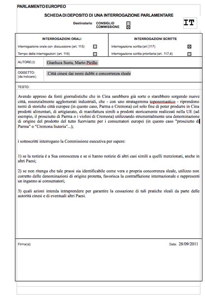 Avendo appreso da fonti giornalistiche che in Cina sarebbero già sorte o starebbero sorgendo nuove città, essenzialmente agglomerati industriali, che – con uno stratagemma toponomastico – riprendono nomi di storiche città europee (in questo caso, Parma e Cremona) col solo fine di poter produrre in Cina prodotti alimentari, di artigianato, di manifattura simili a prodotti storicamente realizzati nella UE (ad esempio, il prosciutto di Parma o i violini di Cremona) utilizzando strumentalmente una denominazione di origine del prodotto del tutto fuorviante per i consumatori europei (in questo caso “prosciutto di Parma” o “Cremona liuteria”…);