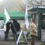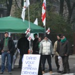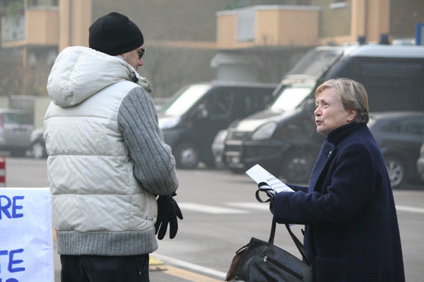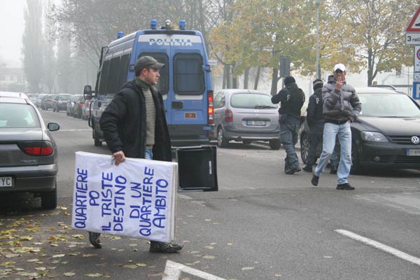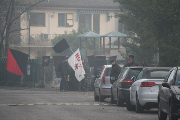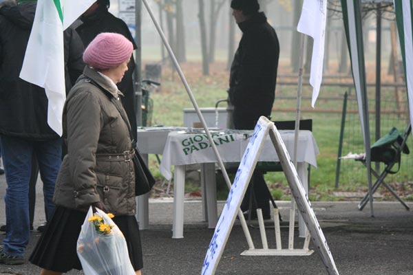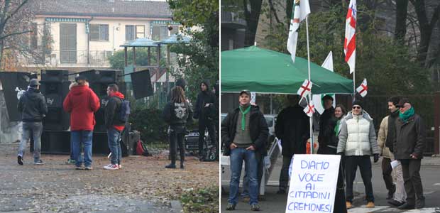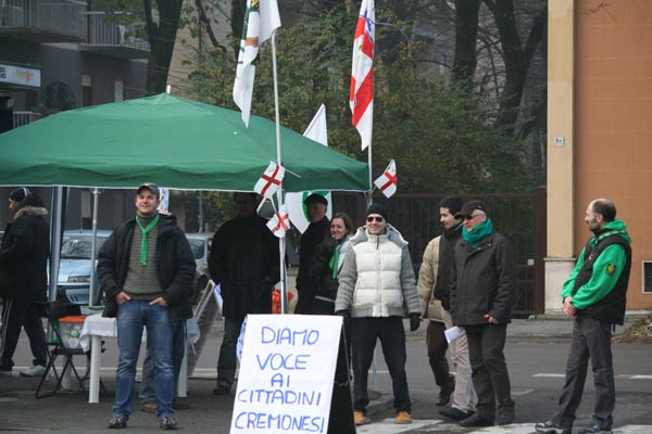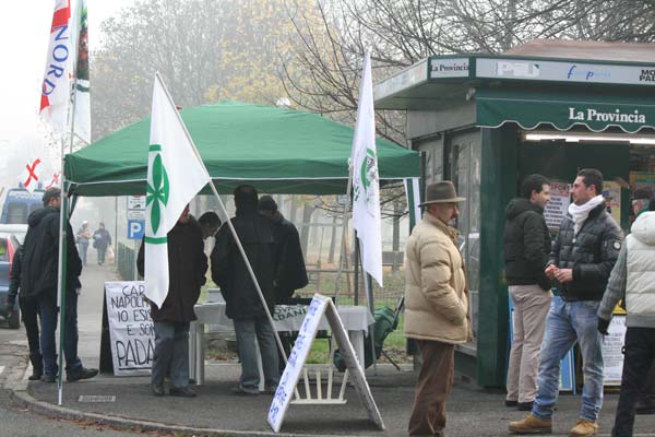 “La Lega di lotta e non più di governo – proclama al microfono un giovane -, fregata dai suoi stessi assessori e consiglieri disobbedienti, tiene il solito becero banchetto. I militanti razzisti in cravattina verde d’ordinanza non pensano alla discarica d’amianto, se ne fregano della privatizzazione dell’acqua, se ne infischiano della devastazione del territorio provocata da opere inutili come il Terzo Ponte e la Strada Sud, non proferiscono parola sull’aumento della Tarsu lanciato dall’amministrazione di centro-destra tanto amata fino a quando era stata promessa la poltrona della presidenza AEM al cuore infranto Alessandro Carpani”.