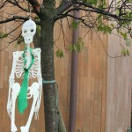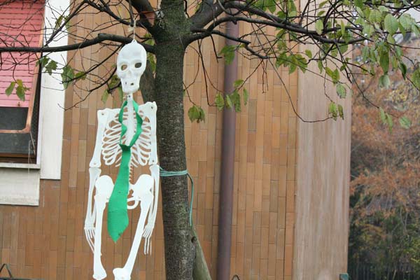 Da un albero sulla via, vicino alla postazione del Kavarna, pende uno scheletro di plastica con un cravattino verde.