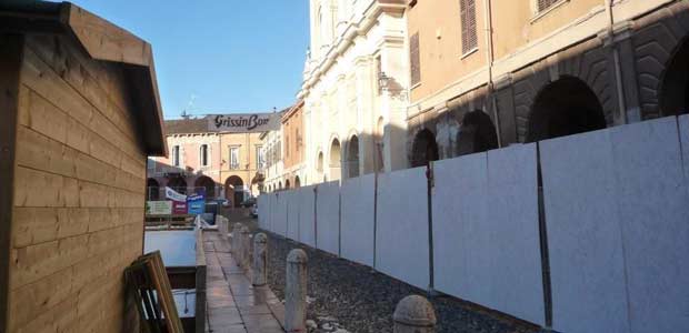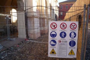 Il Duomo è transennato e chiuso al pubblico. Riaprirà a Pasqua. Nel frattempo tutte le funzioni religiose sono state trasferite nella Chiesa dei Servi. Dice il parroco don Alberto Nicelli:” Questa è la nostra nuova parrocchia. Naturalmente è stata adeguata alle liturgie”.