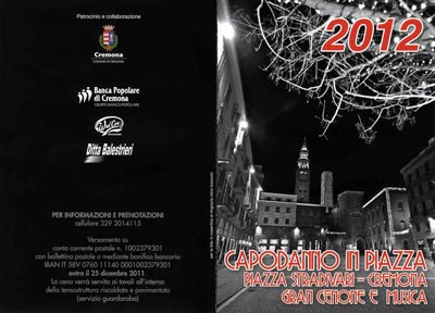 Una festa sobria con menù tradizionale. Questa la proposta del Comune di Cremona per il capodanno 2012 in piazza Stradivari. «Un evento per aggregare giovani e meno giovani, realizzato nostante il momento di crisi per invitare la gente a stare insieme, a socializzare e a trascorre comunque una serata di gioia», ha presentato l’iniziativa l’assessore Claudio Demicheli, affiancato dalla collega Jane Alquati e dal dirigente Maurilio Segalini durante la conferenza di presentazione.