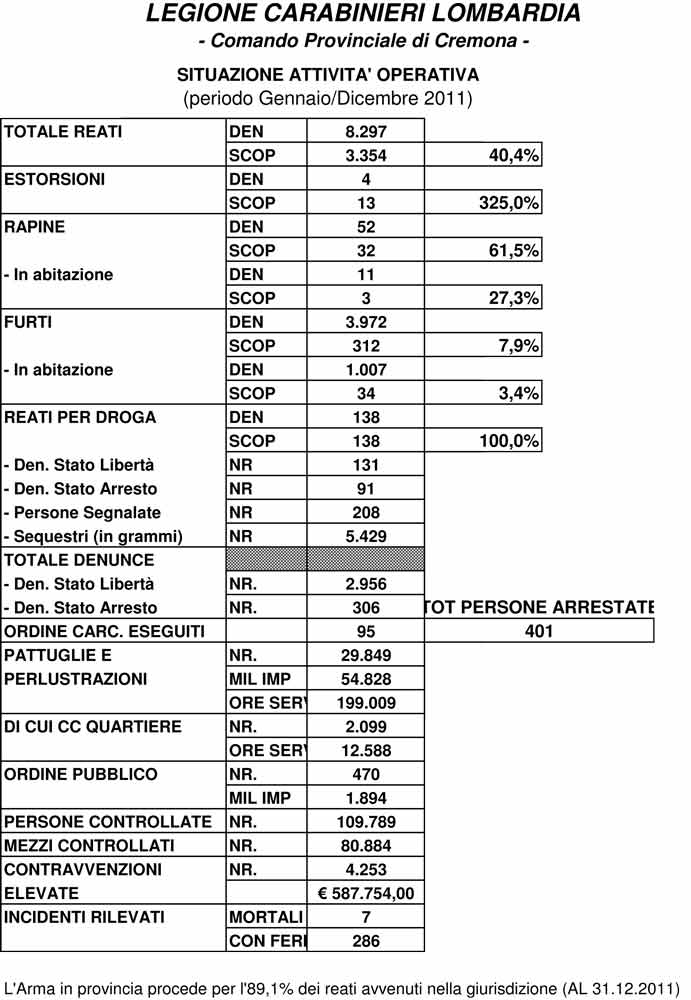 Sono stati illustrati in mattinata, nella caserma di viale Trento e Trieste, i dati del 2011 dell’attività operativa dei carabinieri, alla presenza del comandante provinciale, il tenente colonnello Michele Arcangelo Cozzolino, che ha parlato di lavoro di squadra, e del maggiore Rosario Gemma. Un bilancio che si riferisce al lavoro svolto su tutta la provincia dall’Arma (che ha proceduto per l’89,1% degli illeciti nella giurisdizione). Oltre 8mila i reati denunciati affrontati dai carabinieri (ben 3.354 quelli scoperti dai militari, il 40,4%). Lieve crescita rispetto al 2010. Aumentano le attività di pattuglie e perlustrazioni, arrivate a 199.009 ore di servizio (oltre 12.500 quelle dei carabinieri di quartiere). In totale 401 le persone arrestate. Quasi 3mila le denunce. Intensa l’attività sul fronte del contrasto alla droga e attenzione alla strada. Incremento, nel complesso, per i casi di reati contro il patrimonio trattati dall’Arma (+10%) ma in diminuzione furti in appartamento e rapine.