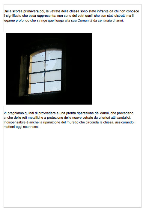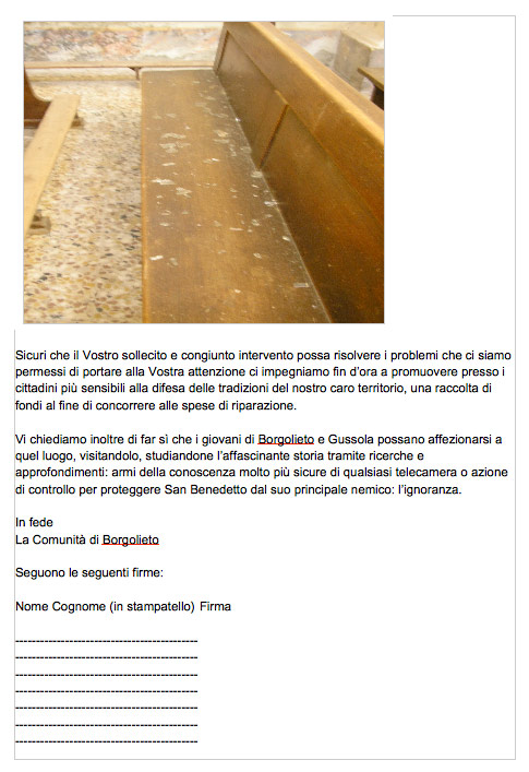 Alcuni abitanti di Borgolieto hanno deciso di realizzare un accorato dossier, completo di fotografie eloquenti, e indirizzarlo a Sindaco, Vescovo, Parroco oltre che ad