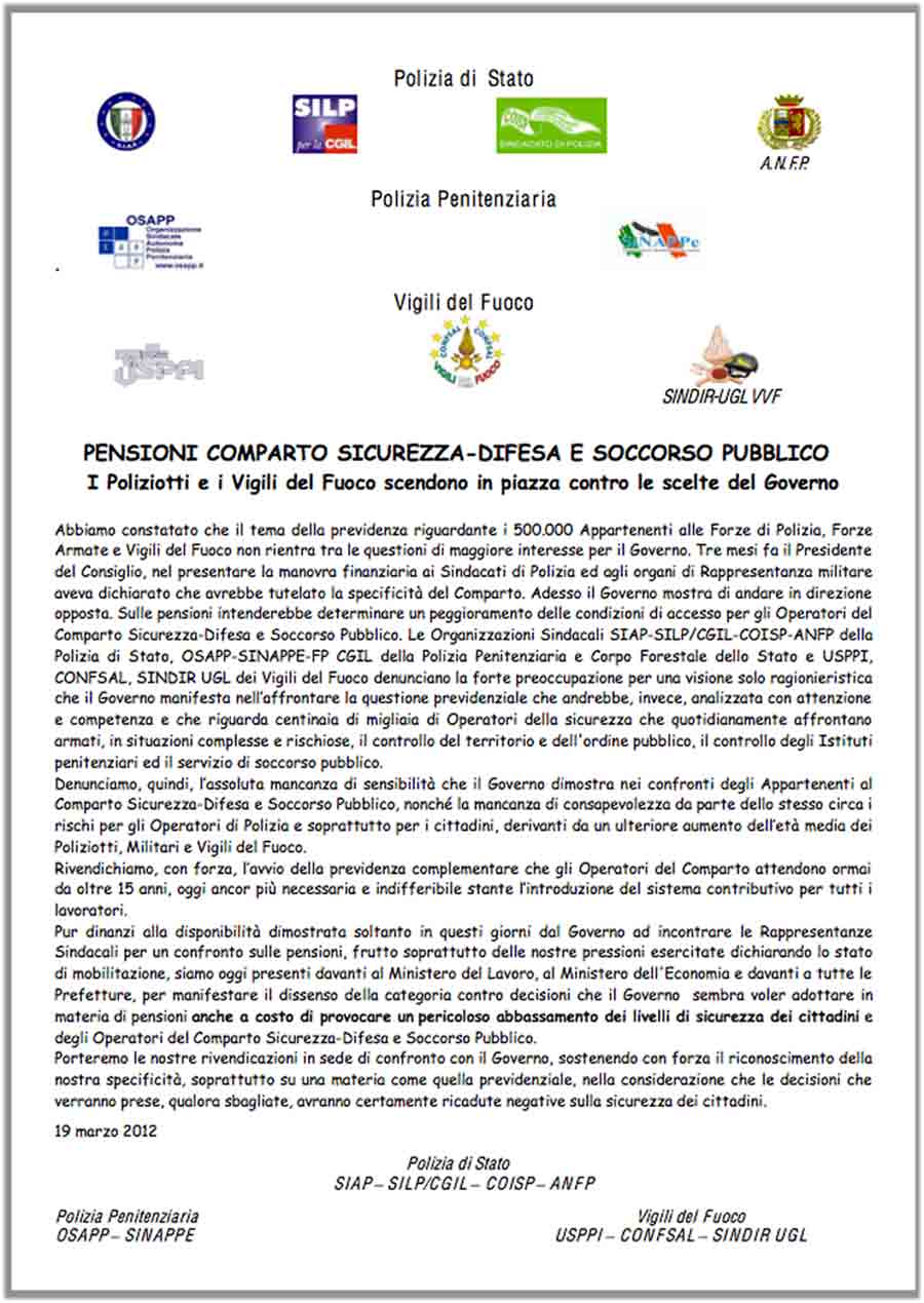 E ancora: “Sulle pensioni intenderebbe determinare un peggioramento delle condizioni di accesso per gli Operatori del Comparto Sicurezza-Difesa e Soccorso Pubblico. Le Organizzazioni Sindacali SIAP-SILP/CGIL-COISP-ANFP della Polizia di Stato, OSAPP-SINAPPE-FP CGIL della Polizia Penitenziaria e Corpo Forestale dello Stato e USPPI, CONFSAL, SINDIR UGL dei Vigili del Fuoco denunciano la forte preoccupazione per una visione solo ragionieristica”.