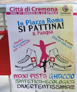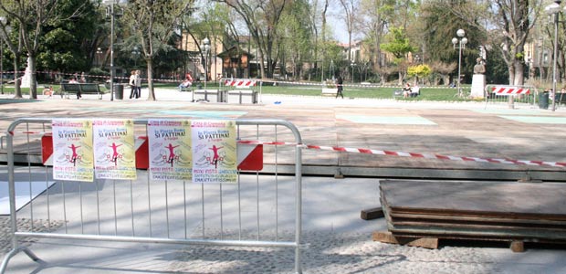 La parte centrale di piazza Roma, davanti alla pagoda, è transennata. In terra pannelli di legno e intorno il nastro bianco e rosso dei lavori. Dalla Svizzera, in arrivo ai giardini un pista del ghiaccio “sintetica, ecologica, divertentissima”, si legge sui volantini appesi intorno allo spazio delimitato. Starà ai giardini dal 31 marzo al 22 aprile. Sui manifesti il logo del Comune di Cremona.