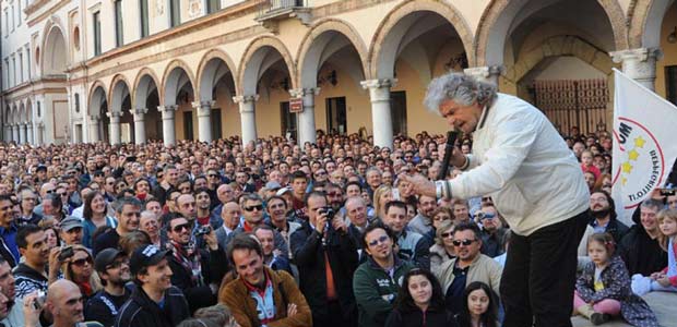 Sopra, Grillo in piazza a Crema (foto Giulio Giordano)