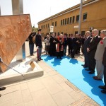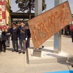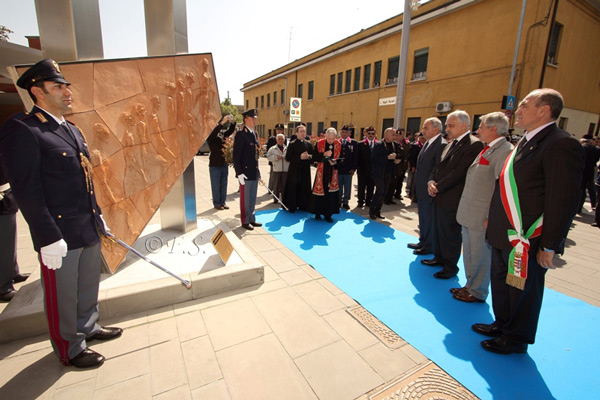 Sopra, Palatucci e il questore Bufano, il prefetto Izzo, il prefetto Bruno di Clarafond e il sindaco Perri davanti alla scultura e alla targa (foto Francesco Sessa)