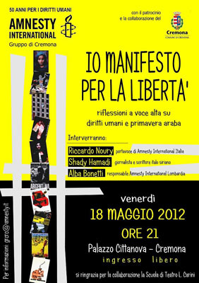 “Io manifesto per la libertà: riflessioni a voce alta su diritti umani e primavera araba”. Questo il titolo della serata organizzata dal Gruppo cremonese di Amnesty International, movimento internazionale per la difesa dei diritti umani, Premio Nobel per la Pace 1977, che festeggia i suoi 50 anni di attività. L’appuntamento a palazzo Cittanova venerdì 18 maggio alle ore 21 (ingresso libero). In programma la presentazione del volume edito in occasione di questa ricorrenza e un dibattito su diritti umani negati con Riccardo NOURY, portavoce di Amnesty International Italia, Shady HAMADI, scrittore italo-siriano promotore della campagna “Un fiocco nero per la Siria” e Alba BONETTI, responsabile di Amnesty International Lombardia.