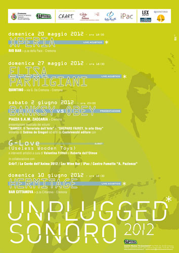 L’Assessorato alle Politiche Giovanili del Comune di Cremona con la collaborazione del Centro Musica “Il Cascinetto”, promuove la quinta edizione della rassegna Unplugged Sonoro 2012. La rassegna, trova così ragion d’essere nell’intento di creare e alimentare ambienti adatti alla valorizzazione delle creatività giovanile cremonese e dando supporto e visibilità a progetti musicali “acustici”. Questo risulta infatti linguaggio immediato e molto apprezzato dal target under e over 18 anche se anomalo rispetto alla tradizione formula live “amplificata”. I ragazzi possono così entrare in contatto con un differente approccio all’esibizione dal vivo, sperimentando di conseguenza una nuova attitudine performativa e relazionale.
