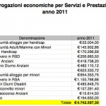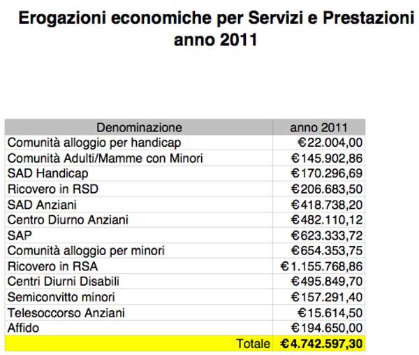 Oltre 4 milioni (esattamente 4.742.597,30 euro) sono stati spesi per erogazioni economiche per Servizi e Prestazioni nel 2011. Di questi la spesa più grande è stata fatta per il ricovero in Rsa, Residenza Sanitaria Assistenziale (1.155.768,86 euro). A seguire, 654.353,75 euro sono stati spesi per Comunità alloggio per minori, 623.333,72 per il Servizio di aiuto alla persone (Sap). A queste erogazioni vanno aggiunte le varie tipologie di spesa che prevedono erogazioni economiche dirette al sostegno ai nuclei familiari, come pagamento bollette, esenzione mensa scolastica, voucher e buoni di varia natura.