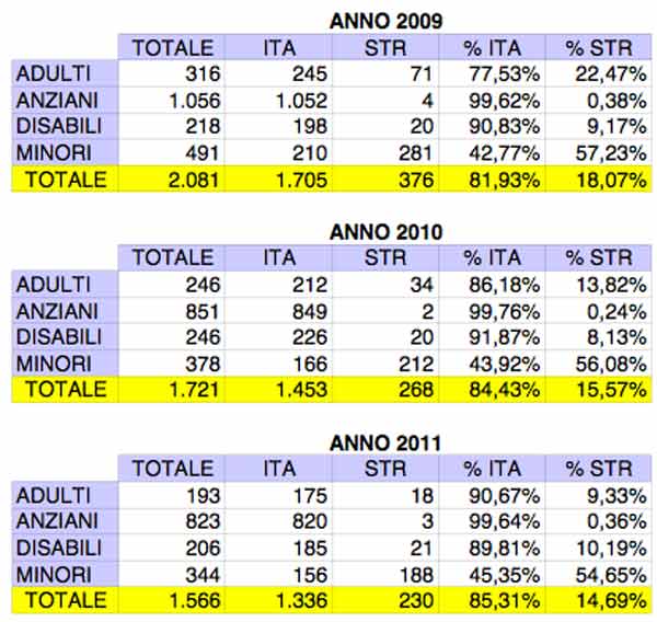 Tra i 3.410 nuclei seguiti dai Servizi Sociali, sono 2.628 quelli italiani (il 77%), 782 quelli stranieri (il 22,93%). Tra gli italiani emergono i nuclei di anziani (1.401 nel 2011), tra gli stranieri quelli legati a minori (576 nel 2011).