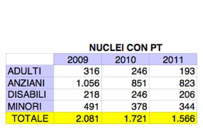 1.566 i nuclei che hanno ricevuto sostegno tecnico o economico nel corso del 2011 (in calo rispetto a 2009 e 2010): 1.336 italiani (l’85,31% , 820 sono anziani) e 230 stranieri (il 14,69%, 188 sono minori). La percentuale riferita ai nuclei con sostegno economico dal 2009 al 2011 per gli italiani è in crescita (81,93% nel 2009, 84,43% nel 2010, 85,31% nel 2011), per gli stranieri è in diminuzione (18,07% nel 2009, 15,57% nel 2010, 14,69% nel 2011).