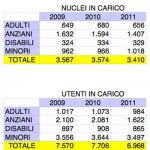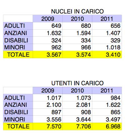 Sono 3.400 i nuclei in carico ai Servizi Sociali nel 2011, 6.968 persone, in calo rispetto ai due anni precedenti. Gli adulti in carico ai servizi sociali sono in calo (1.017 nel 2009, 1.073 nel 2010, 984 nel 2011), come gli anziani (2.100 nel 2009, 2.081 nel 2010, 1.622 nel 2011) e i disabili (897 nel 2009, 908 nel 2010, 865 nel 2011). Il numero dei minori a carico è il più elevato tra gli utenti: 3.497 nel 2011 (erano 3.556 nel 2009 e 3.644 nel 2010).