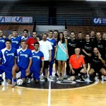 Sopra, le squadre Legno Service e Centro del Freno e organizzatori in occasione della prima sfida al Palazzetto (foto Francesco Sessa)