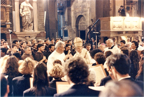 E per ricordare il suo ingresso in Duomo, vogliamo riportare dal bel libro “Il Papa a Cremona” questo breve brano: “Alle 17,40, mentre il Coro Polifonico Cremonese (diretto da don Dante Caifa) intona il “Tu es Petrus”, il Santo Padre varca la soglia della Cattedrale. Non poteva esserci presenza più importante per la celebrazione del quattrocentesimo anno della consacrazione del Duomo. La Cattedrale si presentava avvolta di luce. I fiori facevano corona agli splendidi dipinti esaltati da un sapiente e coraggioso restauro. Lo stesso Pontefice restava incantato dalla maestosità del catino dell’abside e dalla drammaticità della Crocifissione posta in controfacciata”.