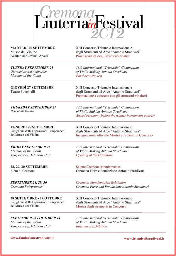 L’apertura del Museo del Violino coinciderà con il XIII Concorso Triennale Internazionale per Strumenti ad Arco che la Fondazione Stradivari organizza dal 1976. La prima data del Liuteria in Festival, in cui il concorso è inserito, è il 25 settembre con la prova acustica degli strumenti finalisti del concorso proprio all’Auditorium Giovanni Arvedi. Ancora all’interno del Museo del Violino, il 28 settembre per l’inaugurazione ufficiale della Mostra strumenti in concorso al padiglione delle esposizioni temporanee. L’esposizione fino al 14 ottobre.