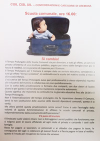 Protesta di Cgil, Cisl e Uil contro la scelta dell’amministrazione di sperimentare per un anno l’esternalizzazione del tempo lungo. Il volantinaggio al Monteverdi si affianca alla raccolta firme lanciata nei giorni