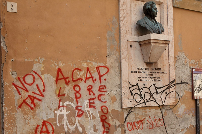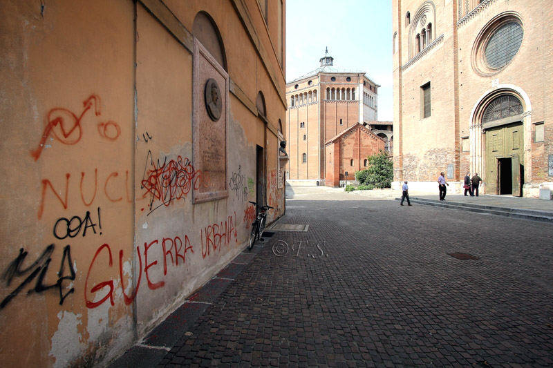 Della questione ci eravamo già occupati, raccontando proprio la brutta sorpresa per i turisti di fianco della Cattedrale: nello spazio che collega piazza Sant’Antonio Maria Zaccaria e Largo Boccaccino, tutto è stato imbrattato, rovinato. Il cartello esplicativo della Cripta di S. Omobono è illegibile e coperto da una ‘A’ bianca. Le lapidi di Federico Caudana, insigne organista e maestro di cappella illustre, di don Dante Caifa e di Remo Lanfranchi sono delle ‘lavagne’ per maleducati. ‘Guerra urbana’, ‘Date fuoco alle caserme’, ‘All cops are pecorelle’, sono frasi che fanno da sfondo al Duomo.