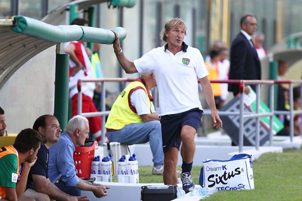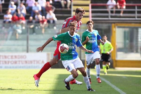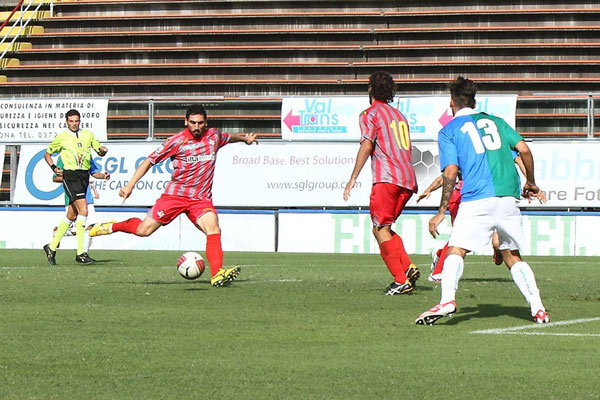 Partita vibrante sin dalle fasi iniziali, con i grigiorossi abili a sfruttare le sponde aeree di Djuric che liberano al tiro Marotta e Carlini. La FeralpiSalò imposta invece una gara tatticamente simile a quella dell’Albinoleffe, chiudendo bene gli spazi e provando a ripartire in contropiede. Nel primo quarto d’ora l’attaccante bosniaco è il più propositivo e il suo costante movimento mette in difficoltà gli avversari. Ci provano Marotta, Carlini, Djuric e ancora Carlini, ma la difesa bresciana è sempre puntuale nelle chiusure. Alla mezz’ora si svegliano gli ospiti con Montella, che dopo una serie di finte impegna Alfonso con un diagonale potente; immediata la reazione grigiorossa con il tentativo di Fietta che regala però soltanto l’illusione del gol ai tremila dello Zini. La spinta degli uomini di Brevi si fa più insistente nel finale di frazione: Marotta dapprima centra il palo, quindi a tu per tu con Gallinetta fallisce la più facile delle occasioni sparando in bocca al portiere bresciano. Al 44’ gli sforzi vengono però premiati da Moi che sul traversone dalla sinistra di Armenise insacca con un preciso colpo di testa.