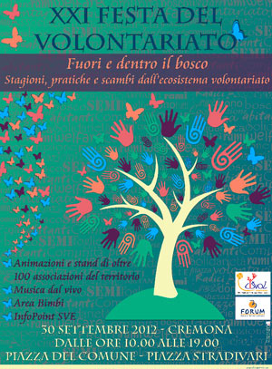 La ventunesima edizione della Festa del Volontariato di Cremona, organizzata dal Cisvol con la collaborazione dei Forum provinciale del Terzo Settore e del Forum Terzo Settore di Cremona e del Cremonese, torna in piazza del Comune e in piazza Stradivari domenica 30 settembre. Alla festa parteciperanno 125 associazioni di volontariato, ciascuna presente col proprio stand, mentre il programma della giornata prevede incontri, spettacoli musicali e di danza dal mattino fino al tardo pomeriggio. Il titolo della nuova edizione è “Fuori e dentro il bosco – Stagioni, pratiche e scambi dall’ecosistema volontariato”, un riferimento diretto al percorso che le associazioni partecipanti hanno intrapreso abbracciando una riflessione sul tema portante della festa – indicato dall’Anno Europeo dell’Invecchiamento Attivo – ma anche una efficacie metafora del volontariato nella società italiana.