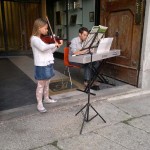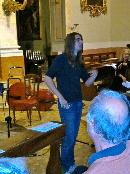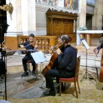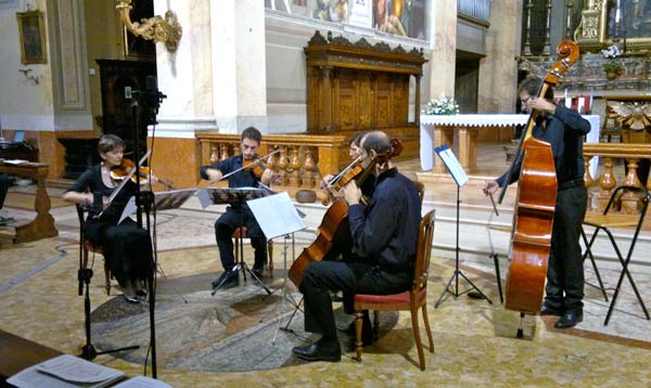 Già la sera di sabato la chiesa di S.Agata aveva ospitato la prima esecuzione pubblica in assoluto di musiche del giovanissimo compositore Luca Natali Stradivari che ha affrontato il numeroso pubblico presente, con tre brani eseguiti dal bravo quintetto d’archi, l’Ensemble Freude, felicemente messo assieme per l’occasione: Daniela Sangalli ed Enrico Mazzucca al violino, Laura Riccardi alla viola, Fausto Solci al violoncello e Massimiliano Confalonieri al contrabbasso.