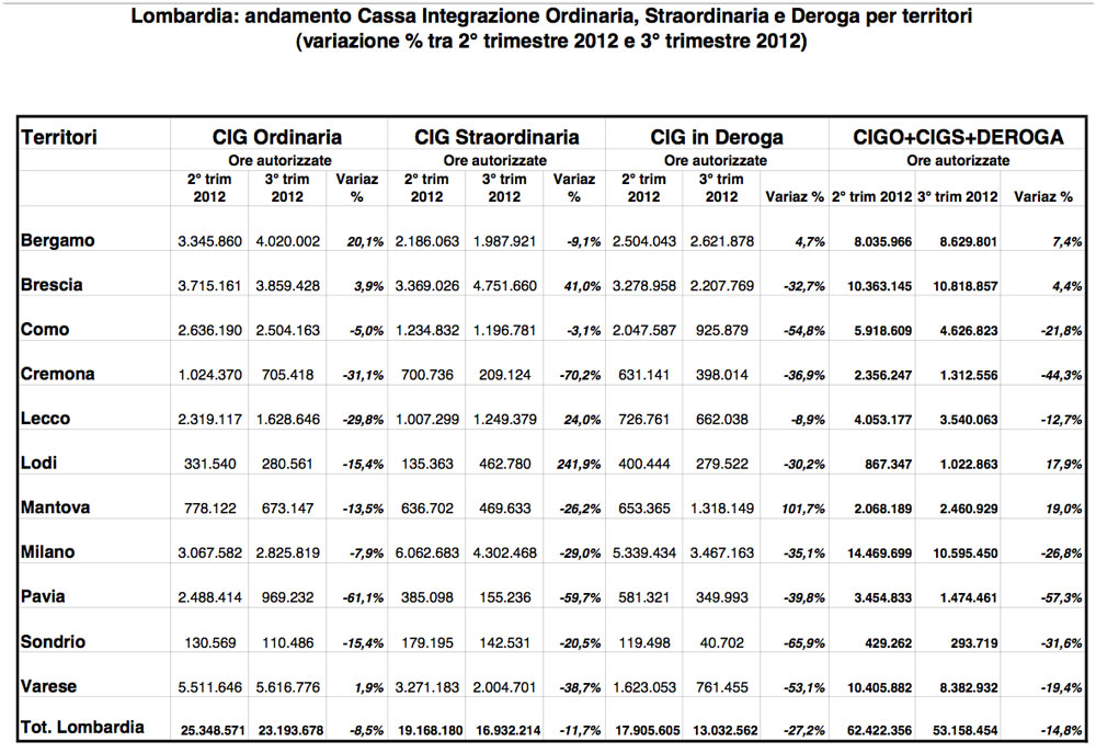 Diminuiscono le ore di cassa integrazione in provincia di Cremona tra il secondo e il terzo trimestre 2012. Forse un piccolo segnale positivo, ma neanche troppo visto che dall’altro lato i licenziamenti schizzano in alto: settembre si è rivelato un mese nerissimo, con un +92% rispetto alle stesso mese dell’anno prima secondo i provvedimenti di mobilità della Sottocommissione regionale per le politiche del lavoro (e in nove mesi sono già stati lambiti i totali di tutto il 2011, il 2010 e il 2009, anni in cui ci si è sempre assestati tra i 1350 e i 1570 licenziati).