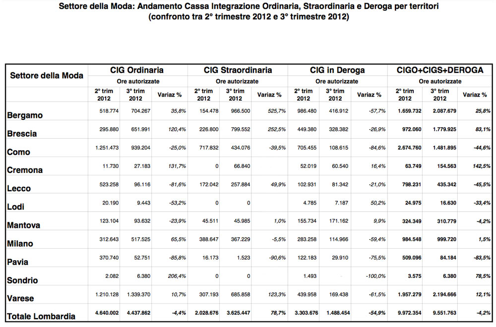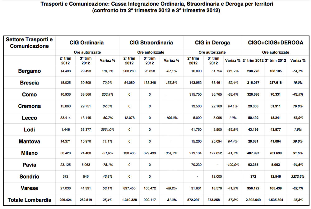 In questo quadro, tuttavia, si inseriscono situazioni preoccupanti: si parla del settore moda (tessile, abbigliamento e pelli) e di trasporti-comunicazioni. Nel primo caso il boom delle ore di cassa integrazione si registra in un +142,5% (tra Cigo, Cigs e Deroga), ovvero da 63.749 a 154.563 ore. Per trasporti e comunicazioni, invece, la crescita è del 76,8% (Cigo, Cigs e Deroga), con un salto da 29.363 ore a 51.911. Meno ore di cassa integrazione registrate nel metalmeccanico (-59,7%), nel settore chimica ed energia (-49,2%), in quello del legno (-45,9%), nell’edilizia (-37,3%), per cartai e poligrafici (-18,5%), agroalimentare (-0,7%), commercio (-36,2%) e vari (-75,4%).