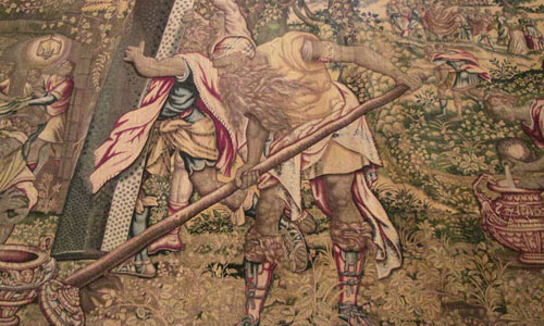 Più piano e meno spettacolare è il secondo arazzo, “La sepoltura di Sansone” , delle stesse misure del precedente. L’ordito è in lana e la trama in lana e seta. Anche qui lo stemma dei Fabbriceri: Canobio, Cremona e Trecchi. Interessante notare come, alla luce di una lampada, si possa vedere in secondo piano la tomba a camera, dove è già stato deposto il cadavere sul quale alcuni uomini stanno per stendere la sindone. E’ uno spaccato delle pratiche delle antiche sepolture con donne impegnate a lavare e imbalsamare la salma.Anche questi arazzi, come quelli già restaurati in precedenza, finiranno nel progettato museo diocesano.