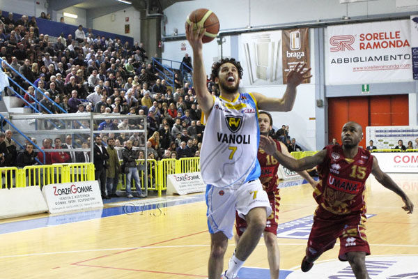 Primo periodo equilibrato con le due squadre che si ribattono colpo su colpo. E’ Venezia ad effettuare il primo break al 6’ sul 16-10 con Young e Diawara, ma i padroni di casa reagiscono prontamente ed impattano 19-19 all’8’ con Harris e Vitali. La Vanoli è molto vivace e disputa un ottimo secondo periodo, infilando 29 punti. Venezia accusa la velocità offensiva dei padroni di casa, soprattutto di Vitali, Johnson. Sottocanestro bene Vitali a stento fermato dalla retroguardia veneta. La Vanoli dal 24-28 del 12’ effettua una lunga accelerazione e ribalta in continuità la situazione sul 51-37 al 19’. Mazzon allenatore dell’Umana protesta con gli arbitri che a suo dire fischiano troppo ai danni dei suoi giocatori. Si becca un tecnico. All’intervallo 53-39.