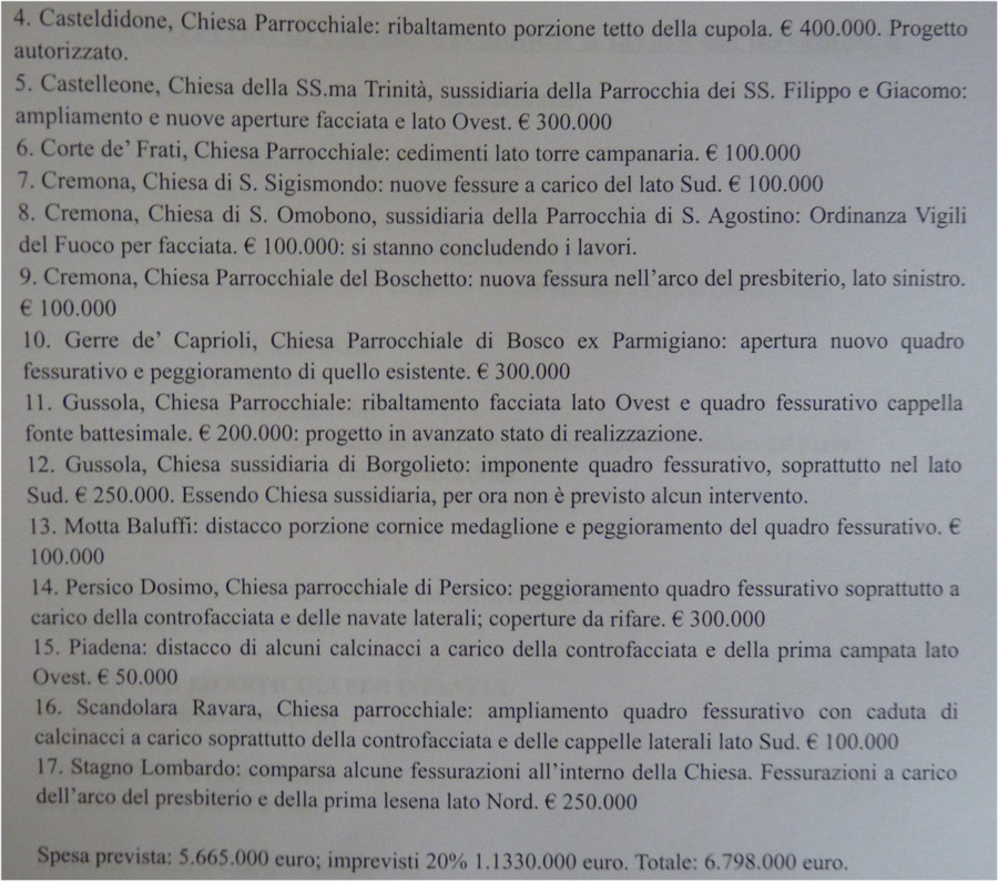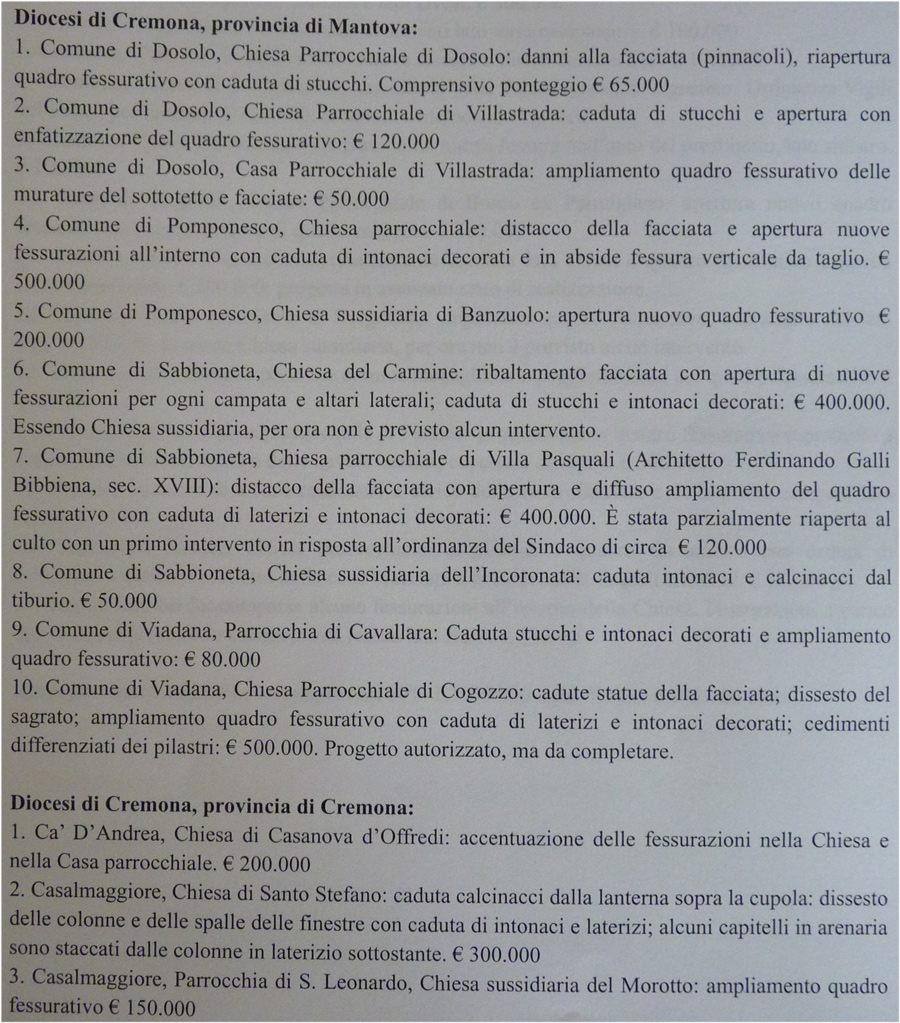 La parola è infine passata a monsignor Achille Bonazzi, responsabile Beni culturali della Diocesi. Ha delineato la situazione delle chiese (parrocchiali e non) “ferite” dal sisma. Sono una decina in provincia di Mantova (ma in Diocesi di Cremona) e 17 nel territorio cremonese. Alcune sono ancora completamente chiuse (tra queste, precedenza ai lavori per quelle parrocchiali, come indicato dal vescovo Dante Lafranconi). La stima dei danni parla di 7 milioni di euro (“ma i preventivi sono sempre destinati a salire”). Poche centinaia di migliaia gli euro effettivamente a disposizione. “E dallo Stato e dalla Regione non abbiamo ricevuta nulla”. Le chiese vengono identificate “come beni culturali” e per questo non hanno la priorità per gli stanziamenti; “in realtà, però, non si tratta semplicemente di luoghi di culto, ma sono posti dove una comunità si sviluppa a livello culturale e sociale, oltre che religioso”. Un sostegno arriva ora dalla vendita solidale.
