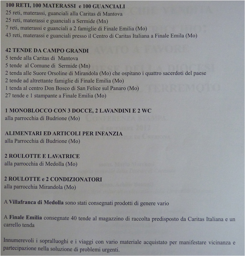 Dopo gli importanti aiuti forniti ai cittadini, ci si muove ora anche per i luoghi danneggiati (le priorità sono state sottolineate da don Claudio Rasoli aprendo l’incontro con i giornalisti: “Prima gli uomini, poi le chiese”). Monsignor Mario Marchesi, vicario generale della Diocesi, ha parlato dell’importanza delle offerte delle persone (“tante sono le attività e le opere di carità portate avanti in Diocesi, non ci sono risorse stabili e per questo sono fondamentali le offerte”). Alberto Auricchio, amministratore delegato dell’azienda del “formaggio della solidarietà” ha ricordato: “Partecipiamo sempre a iniziative del genere dopo eventi catastrofici, come accaduto per il terremoto dell’Abruzzo. Per noi è importante aiutare il territorio. Oltre a quanto raccolto con il provolone, contribuiremo con un euro per ogni chilo venduto”. Don Antonio Pezzetti, direttore di Caritas cremonese: “Faremo rete con le parrocchie organizzando la distribuzione”.
